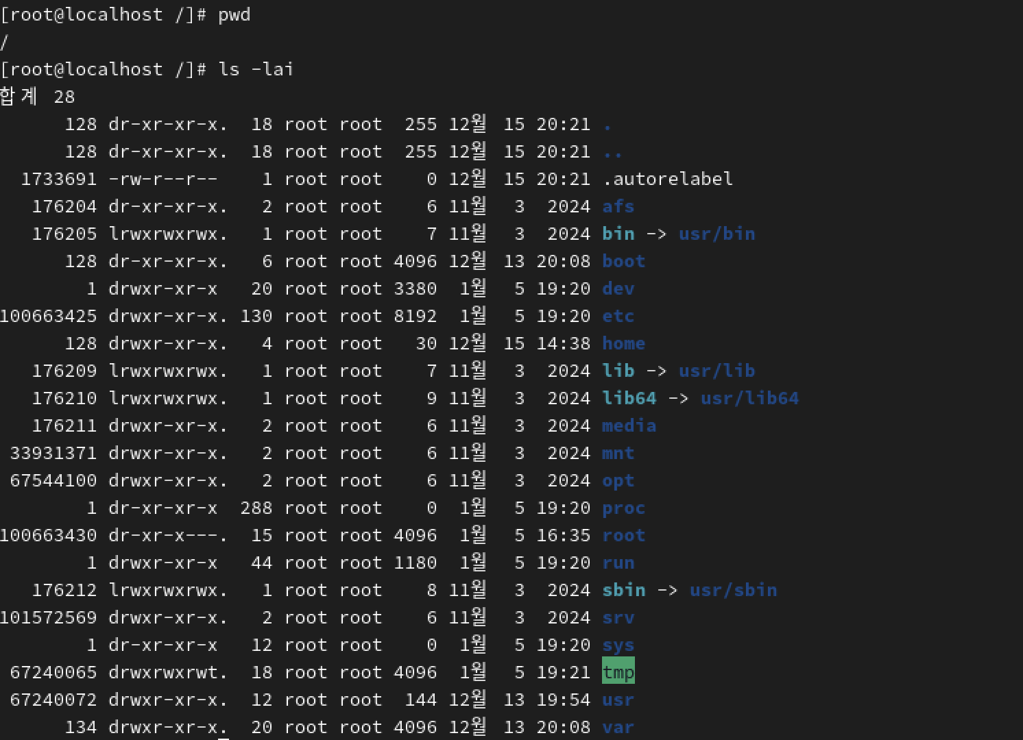 l(Long): 파일의 상세 정보(권한, 소유자, 크기, 수정 날짜 등)를 리스트 형식으로 보여줍니다.a(All): 마침표(.)로 시작하는 숨겨진 파일과 디렉토리(.,..)까지 모두 보여줍니다.i(Inode): 파일이나 디렉토리 왼쪽에 해당 항목의 inode 번호를 표시합니다.