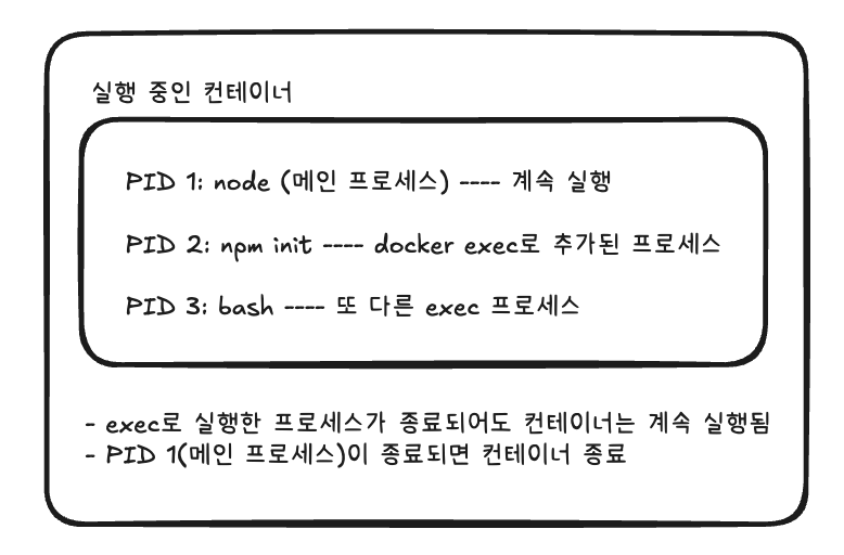 | docker exec -it <container_name> npm init | 실행 중인 컨테이너에 추가 명령 | 메인 프로세스 유지 |
